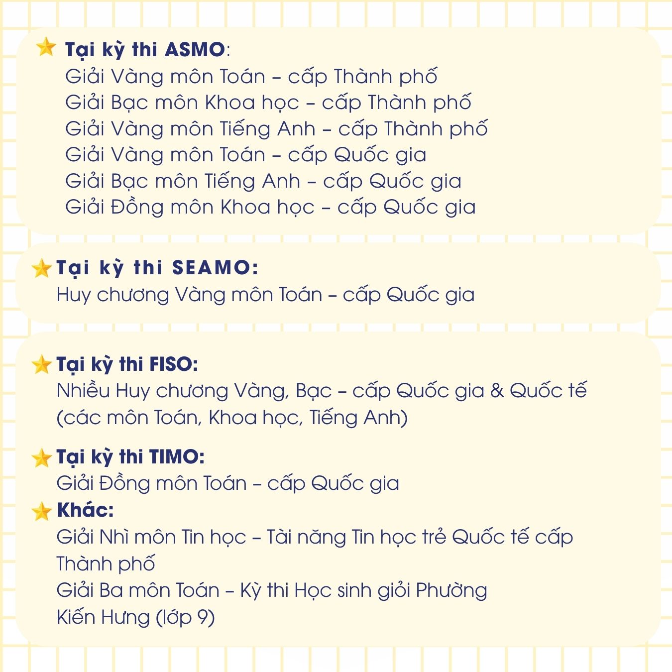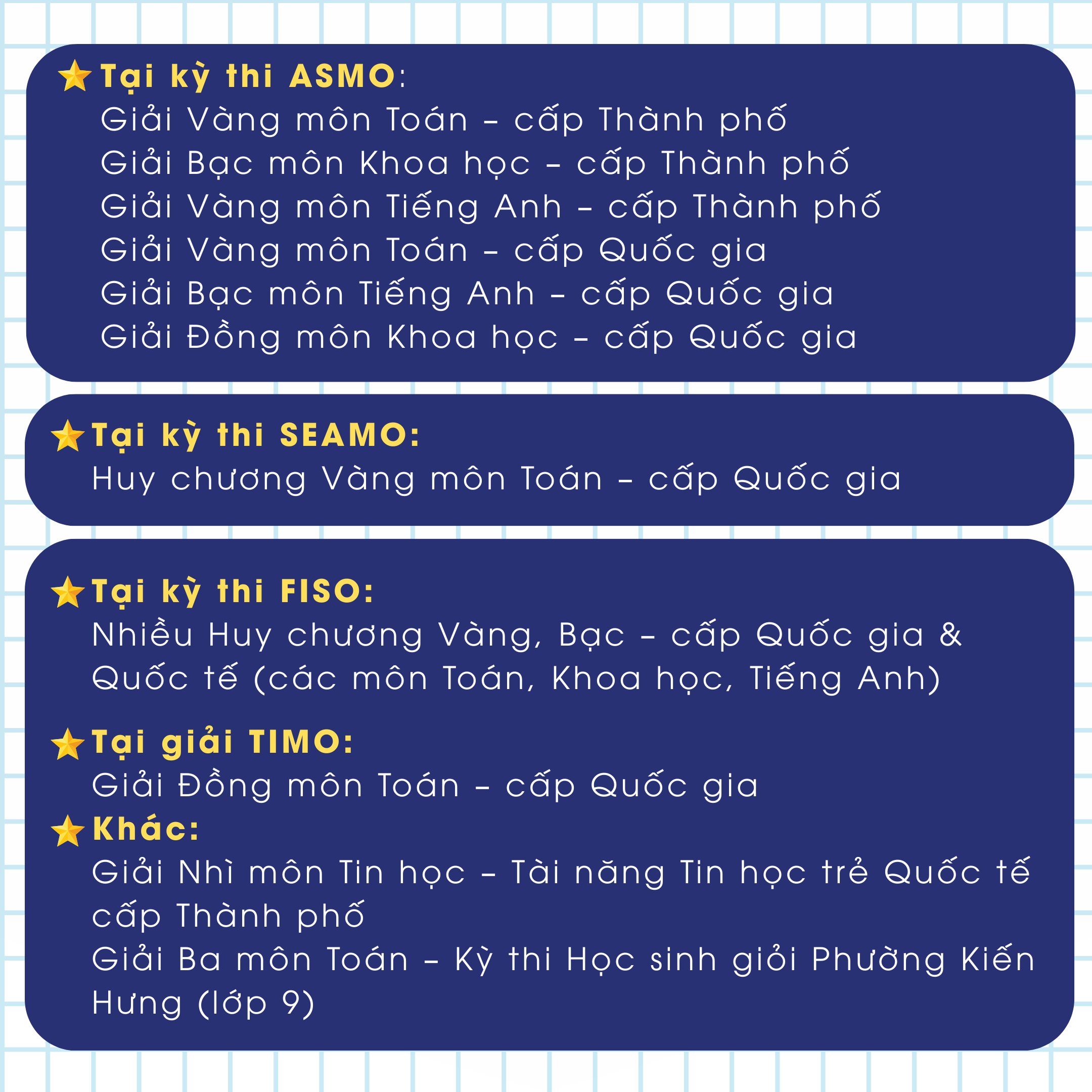 Minh bắt đầu tham gia các kỳ thi học thuật ngay từ những năm đầu THCS. Qua từng năm, phạm vi kiến thức được mở rộng, yêu cầu tư duy ngày càng cao, áp lực cạnh tranh lớn hơn. Mỗi giai đoạn là một bước nâng chuẩn cho chính mình.
