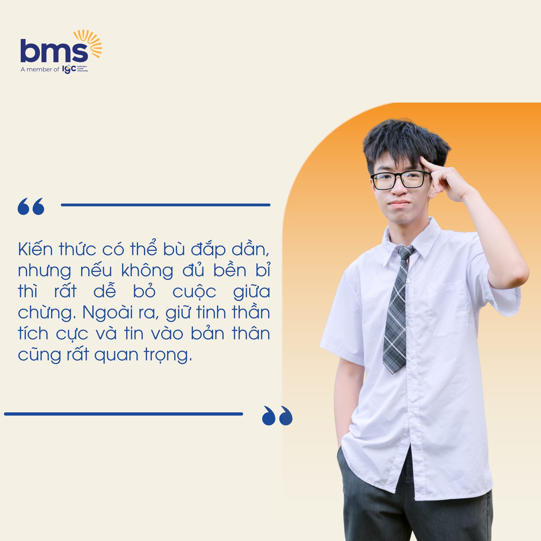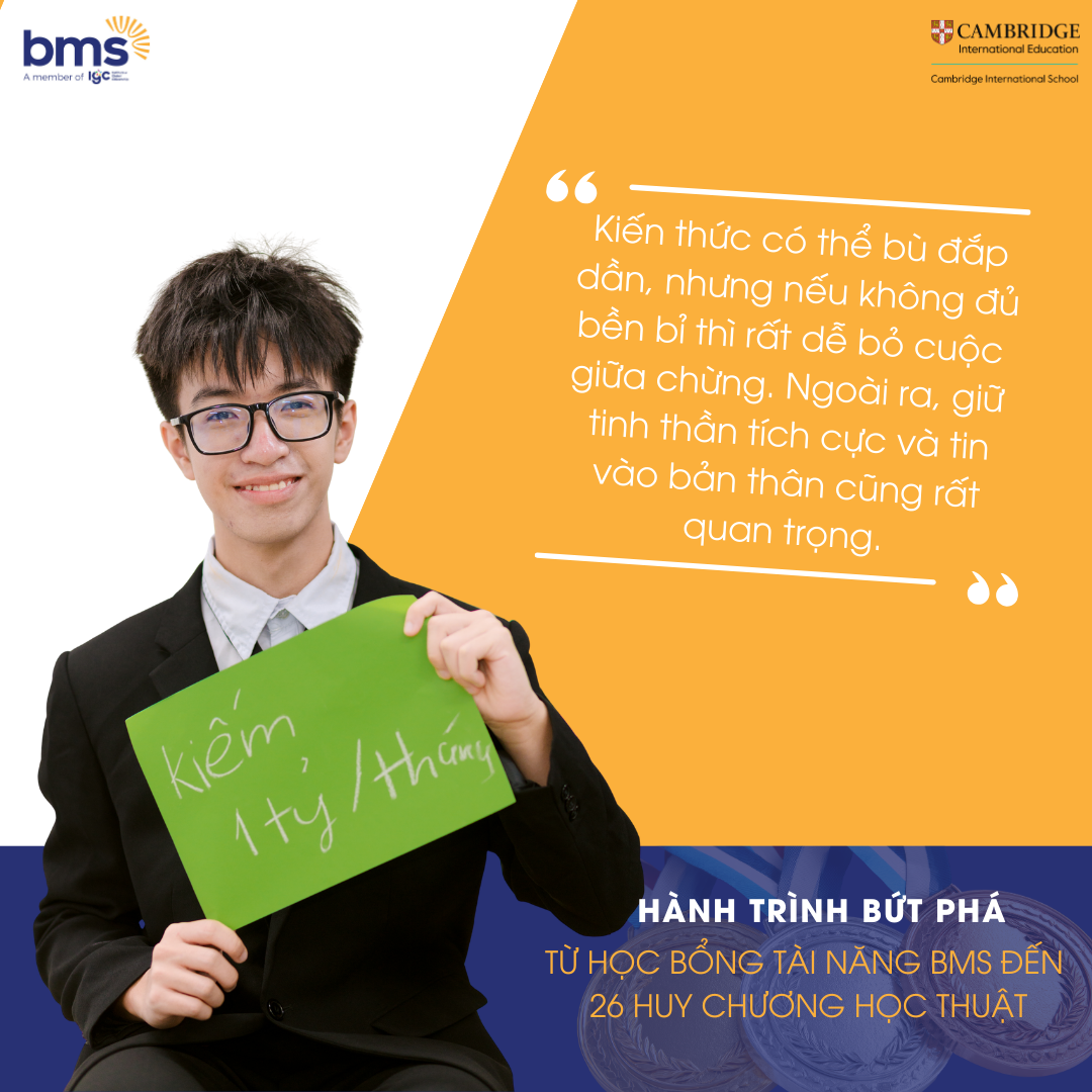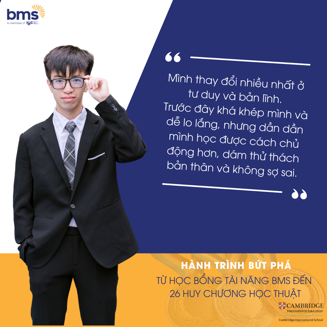 Bốn năm THCS là quãng thời gian Minh bền bỉ rèn luyện tư duy, kỹ năng và bản lĩnh, tạo nền tảng vững chắc cho những bước tiến dài hơn. Tiếp nối hành trình ấy, Minh được tuyển thẳng vào Hệ Tài năng THPT và xuất sắc đạt học bổng 90% học phí, đánh dấu năm thứ 5 liên tiếp chinh phục học bổng tại BMS với tâm thế chủ động và sẵn sàng cho những mục tiêu cao hơn.
