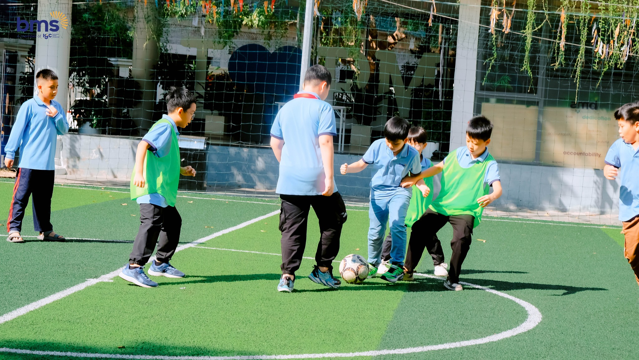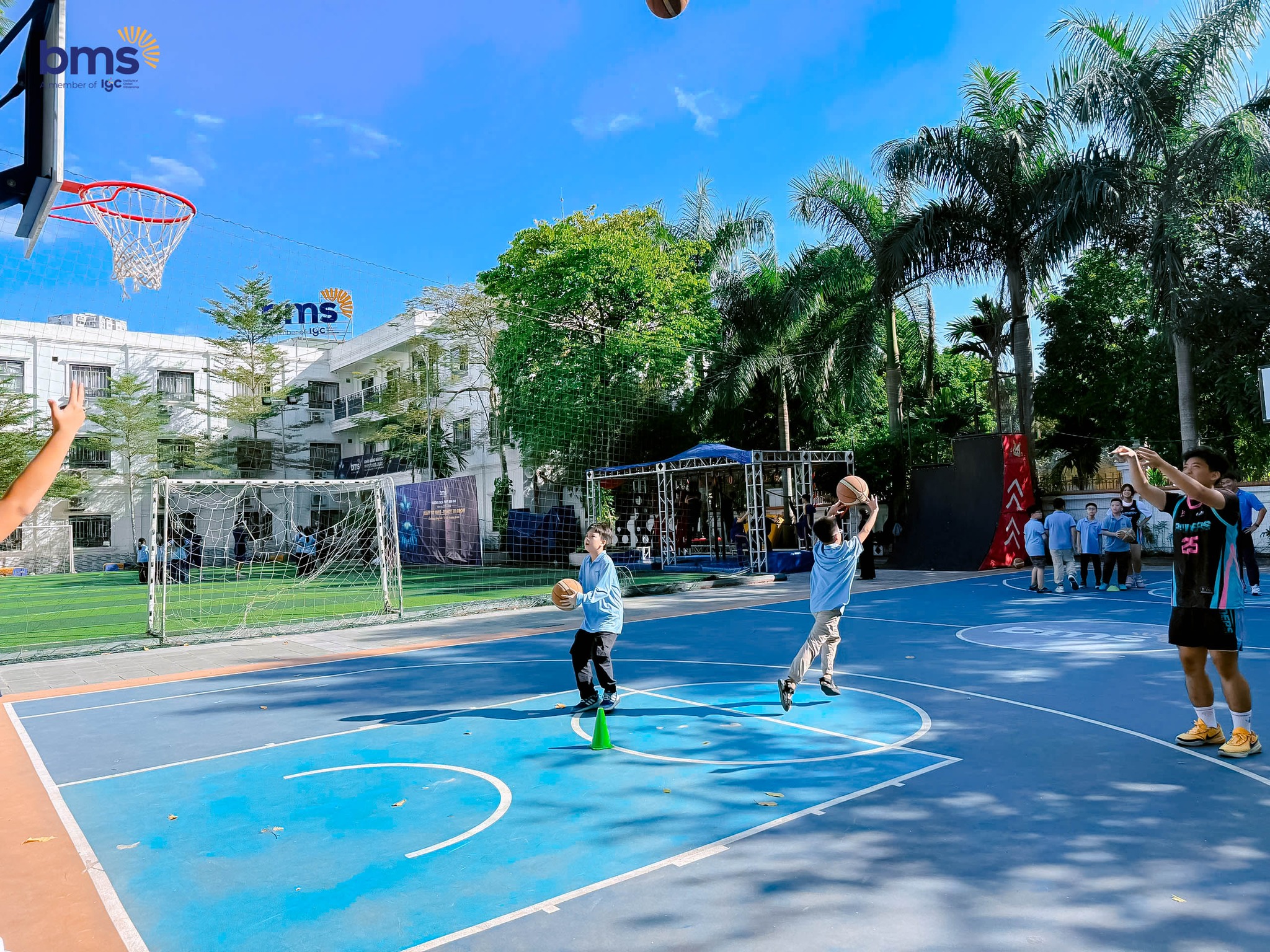 Trên sân thể thao, BMSers thử sức với bóng đá, bóng rổ và bóng sọt. Dưới sự hướng dẫn tận tình của giáo viên và các anh chị trợ giảng, các bạn phối hợp nhịp nhàng, cổ vũ nhau hết mình. Tiếng reo hò, những bước chạy nhanh nhẹn và nụ cười rạng rỡ lan tỏa khắp sân, tạo nên không khí sôi động và tràn đầy năng lượng.