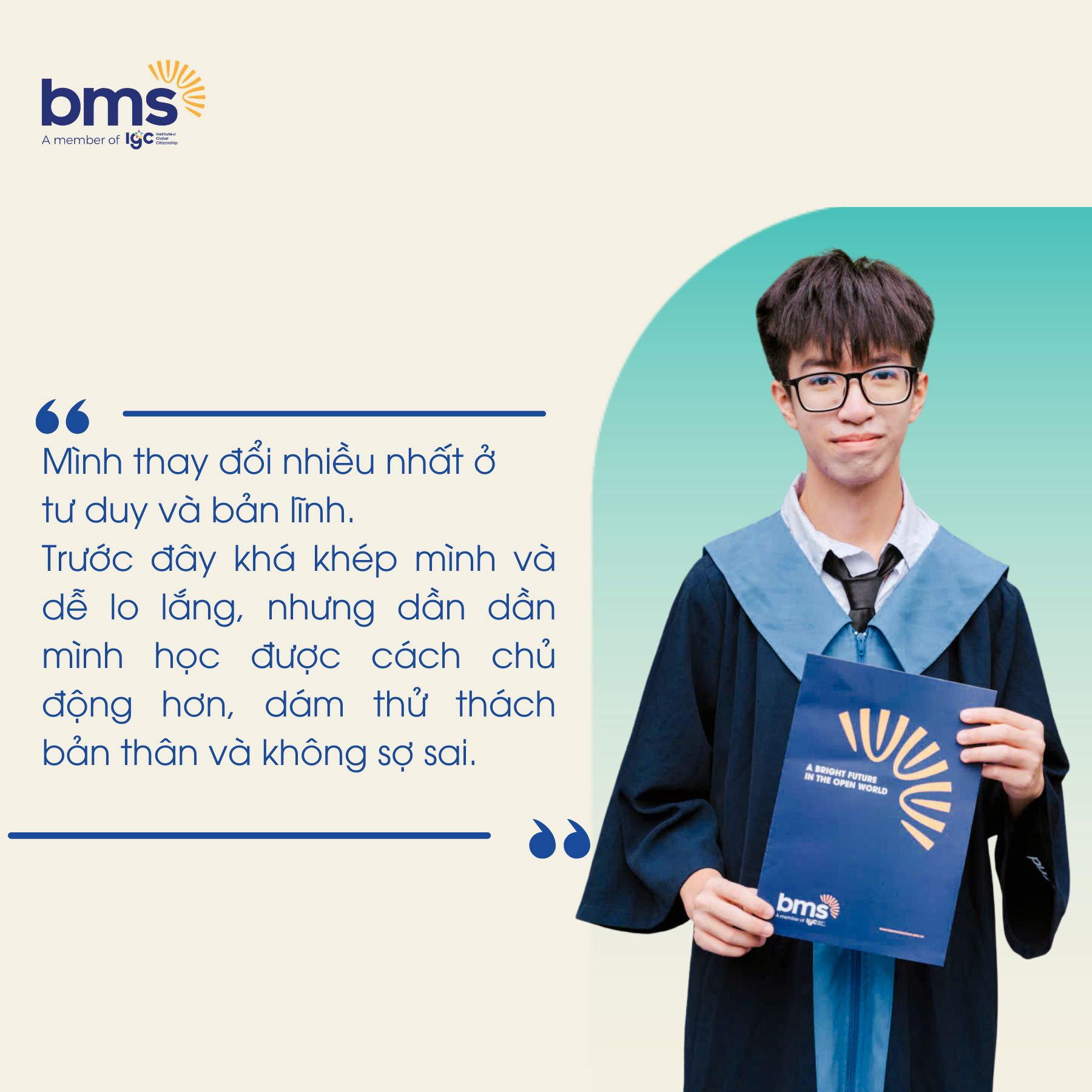 Bốn năm THCS là quãng thời gian Minh bền bỉ rèn luyện tư duy, kỹ năng và bản lĩnh, tạo nền tảng vững chắc cho những bước tiến dài hơn. Tiếp nối hành trình ấy, Minh được tuyển thẳng vào Hệ Tài năng THPT và xuất sắc đạt học bổng 90% học phí, đánh dấu năm thứ 5 liên tiếp chinh phục học bổng tại BMS với tâm thế chủ động và sẵn sàng cho những mục tiêu cao hơn.