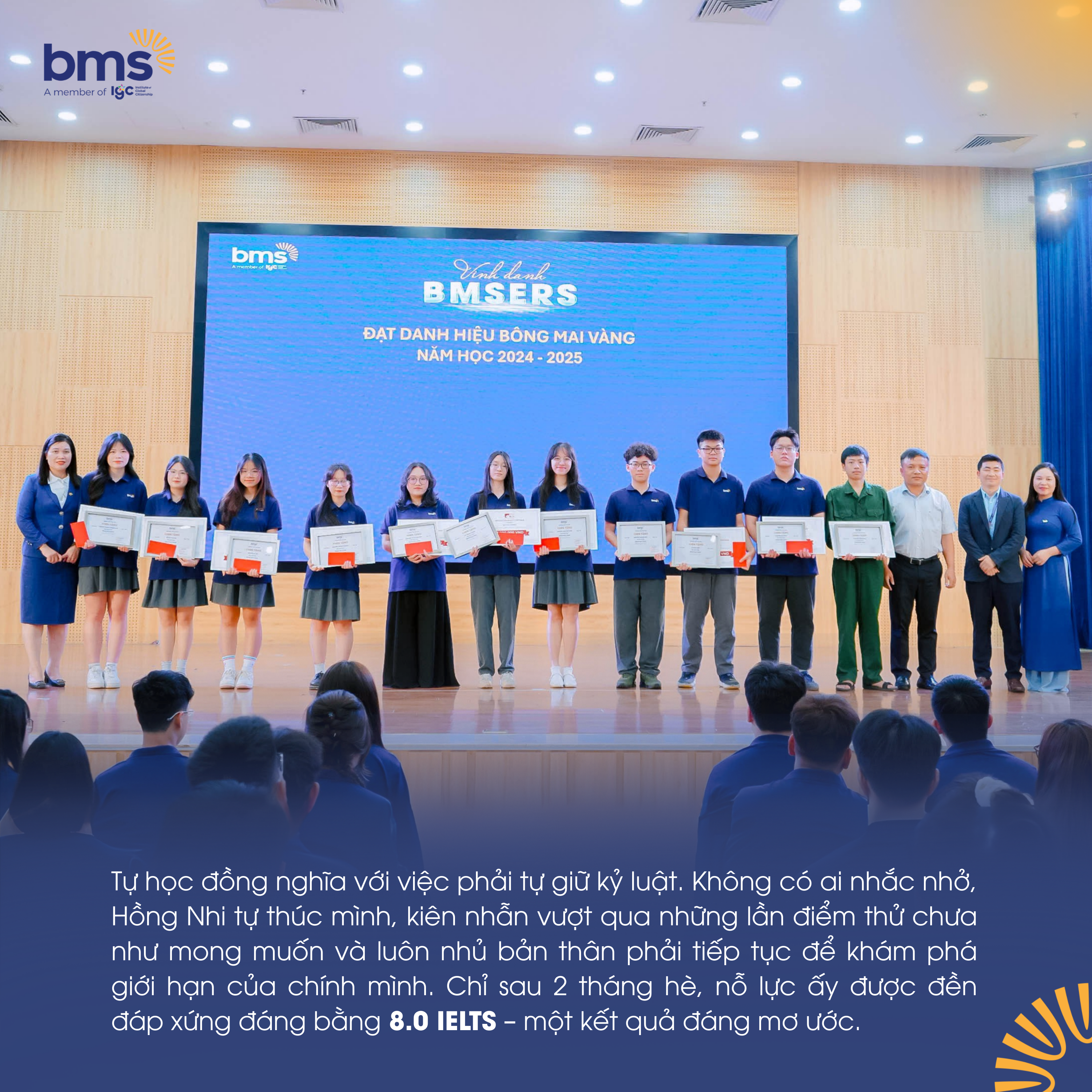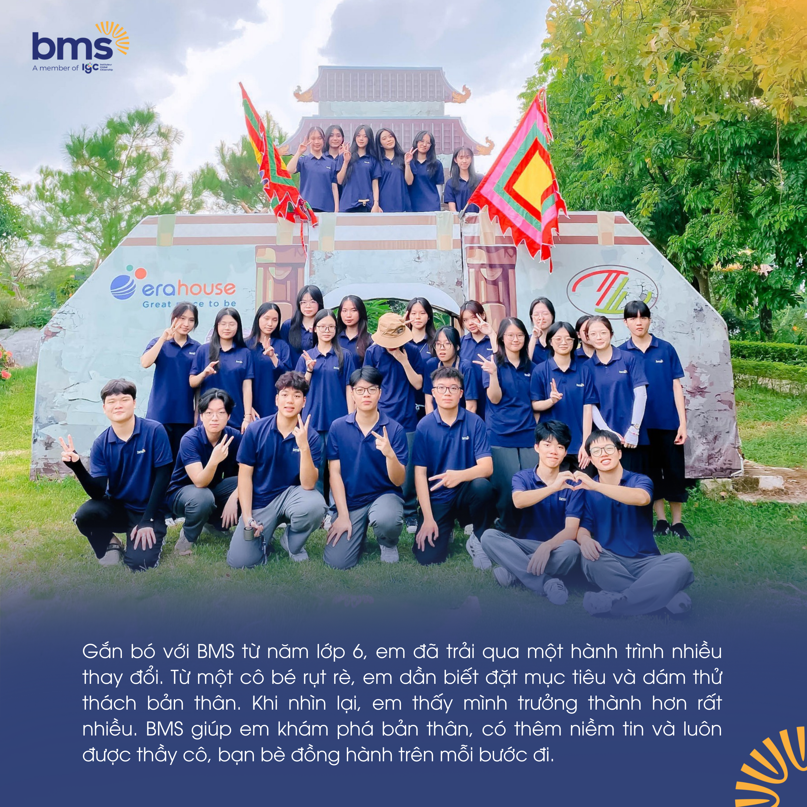Gắn bó với BMS từ năm lớp 6, Nguyễn Hồng Nhi đã đi qua một hành trình nhiều đổi thay. Từ một cô bé rụt rè, em trở thành học sinh biết đặt mục tiêu, dám thử thách bản thân. “Khi nhìn lại, em thấy mình trưởng thành hơn rất nhiều. BMS là nơi giúp em khám phá bản thân, có thêm niềm tin và luôn được thầy cô, bạn bè đồng hành.”